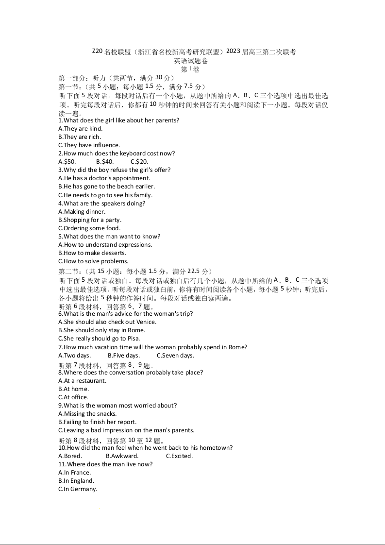 高三英语+答案-浙江省Z20名校联盟2023届高三上学期第二次联考