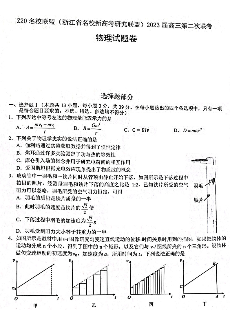 高三物理+答案-浙江省Z20名校联盟2023届高三上学期第二次联考