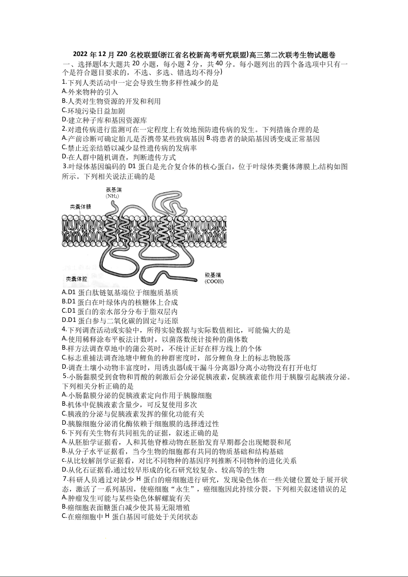 高三生物+答案-浙江省Z20名校联盟2023届高三上学期第二次联考