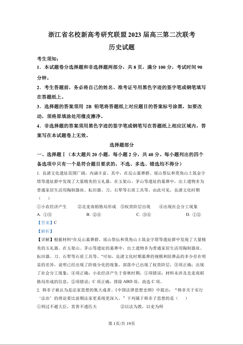 高三历史(精品解析版)-浙江省Z20名校联盟2023届高三上学期第二次联考