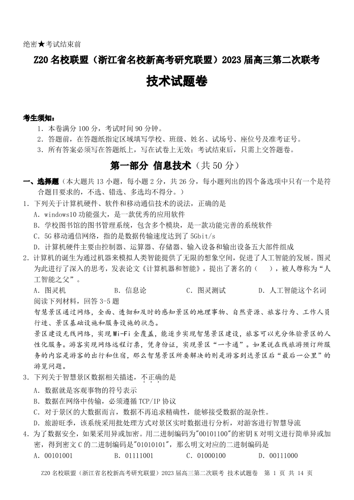 高三技术-浙江省Z20名校联盟2023届高三上学期第二次联考