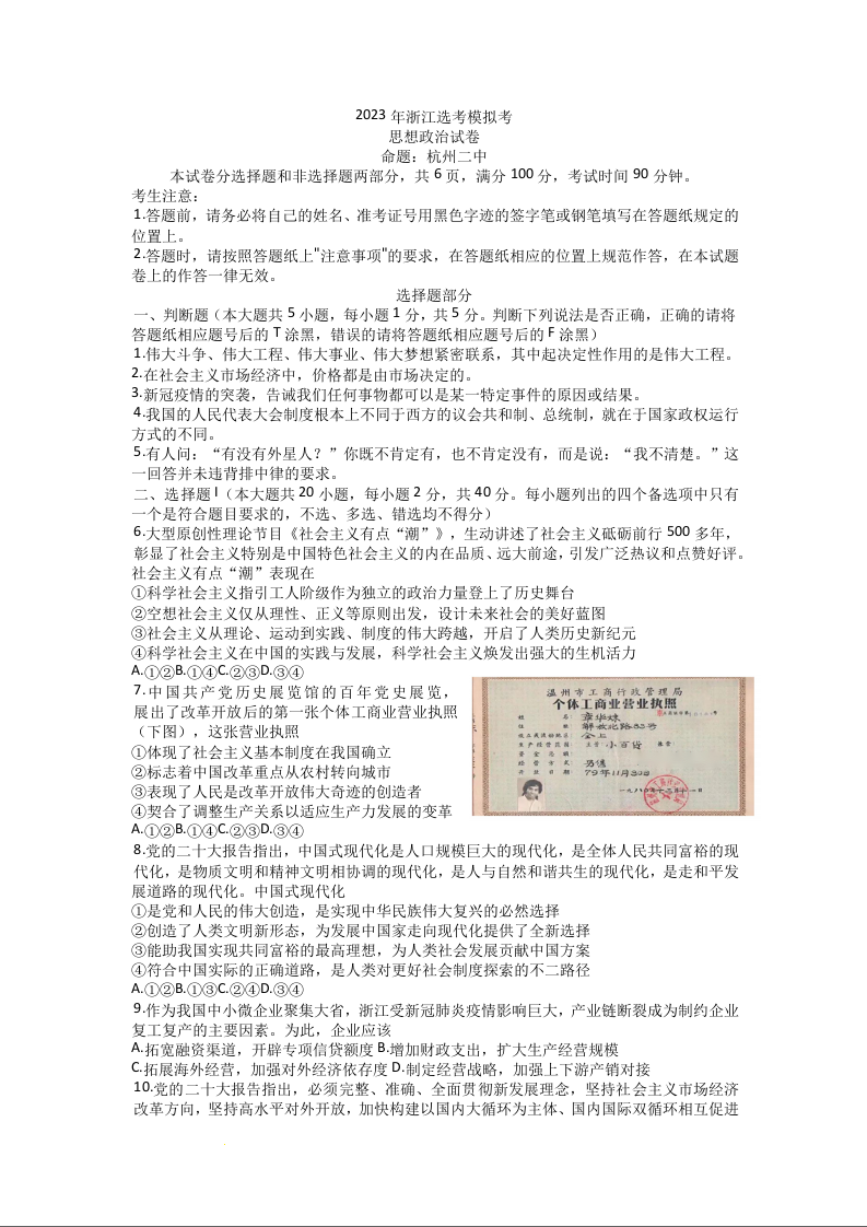高三政治+答案-浙江省杭州二中、温州中学、金华一中、绍兴一中四校2022-2023学年高三上学期联考