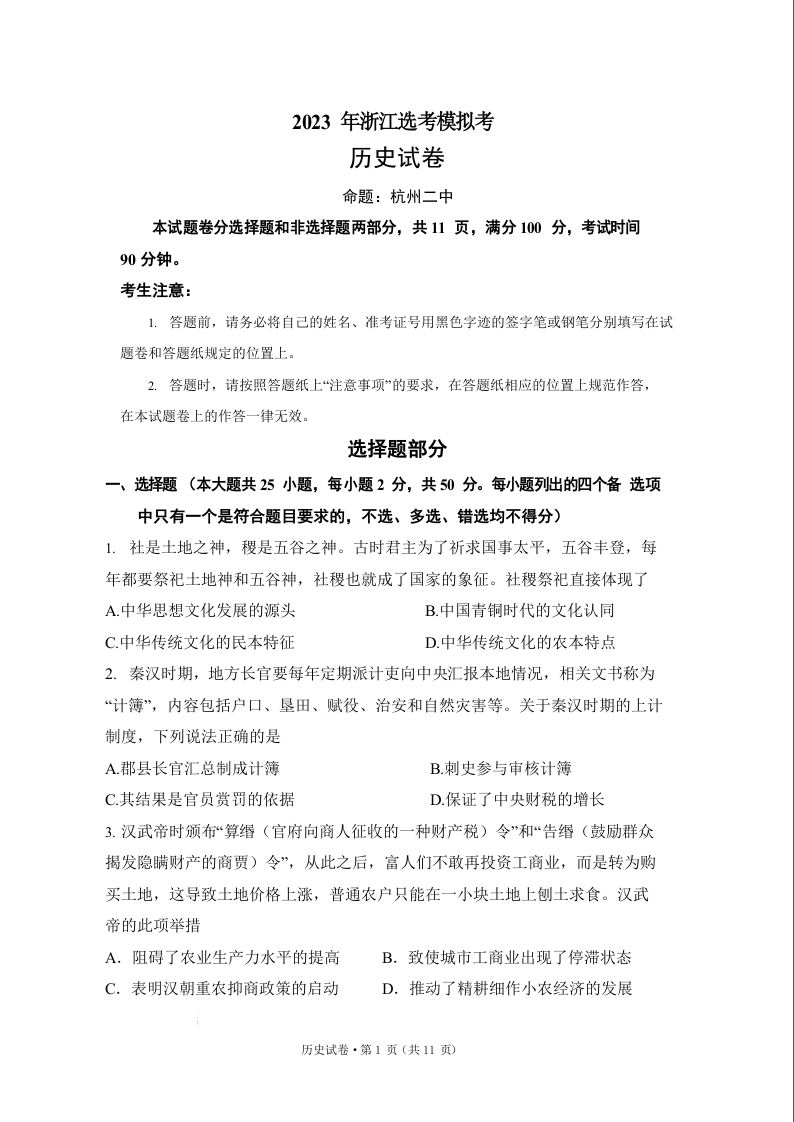 高三历史-浙江省杭州二中、温州中学、金华一中、绍兴一中四校2022-2023学年高三上学期联考