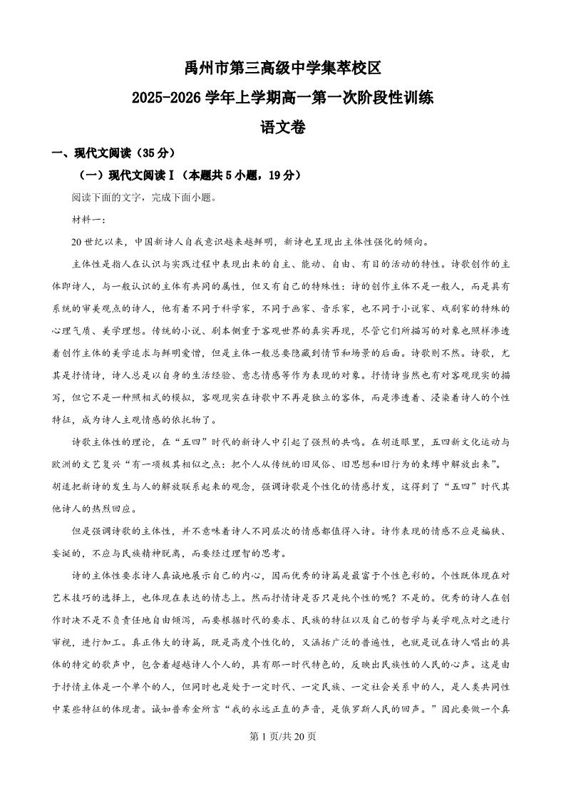 高一语文(精品解析版)--河南省许昌市禹州市第三高级中学2025-2026学年高一上学期9月月考