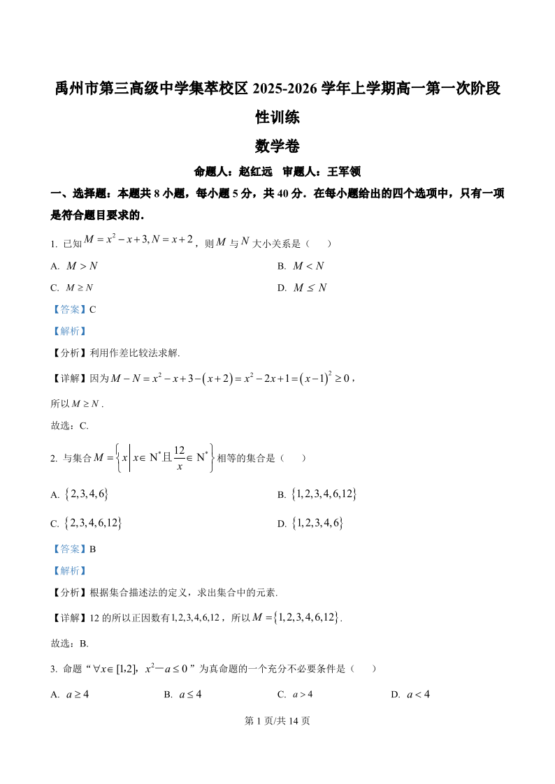 高一数学(精品解析版)--河南省许昌市禹州市第三高级中学2025-2026学年高一上学期9月月考