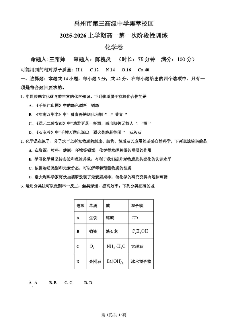 高一化学+答案--河南省许昌市禹州市第三高级中学2025-2026学年高一上学期9月月考
