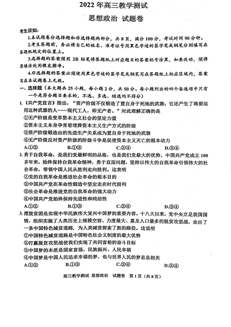 高三政治+答案-浙江省嘉兴市2023届高三上学期12月教学测试试题(一模)