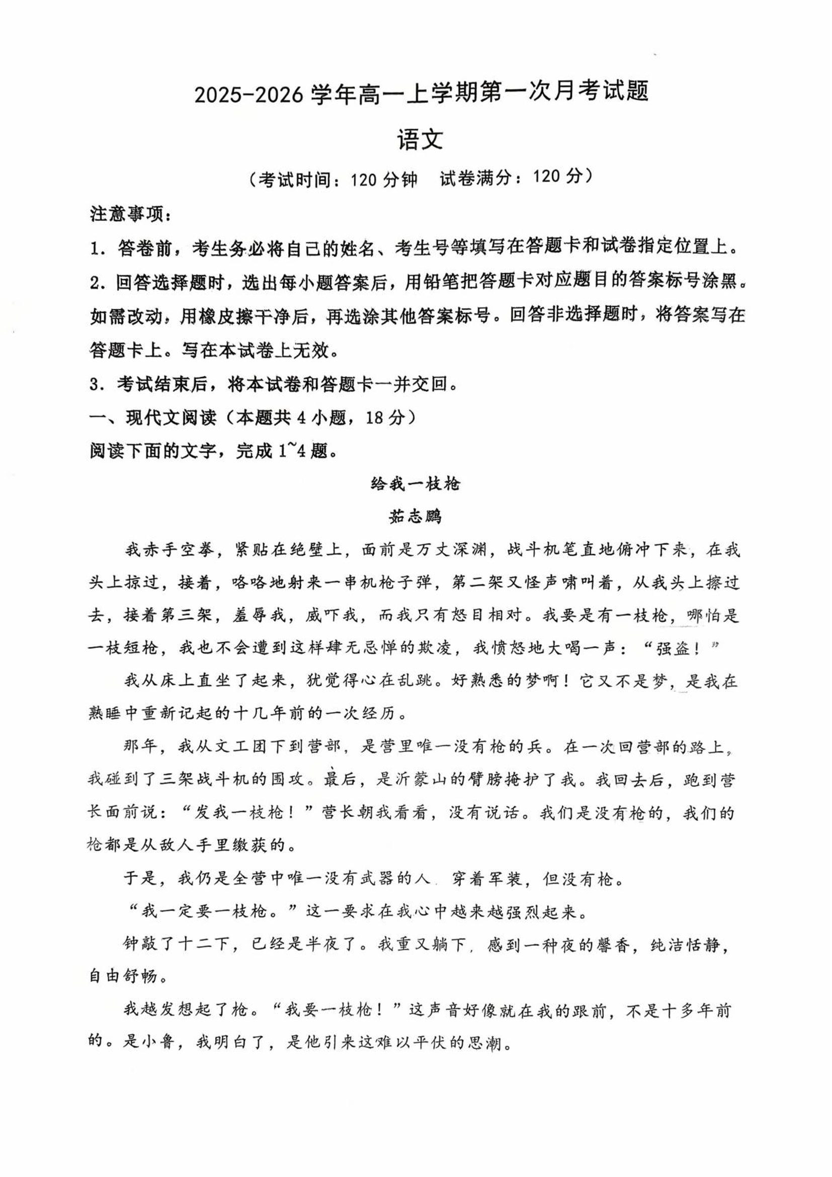 高一语文--河北省保定市部分学校2025-2026学年高一上学期9月月考