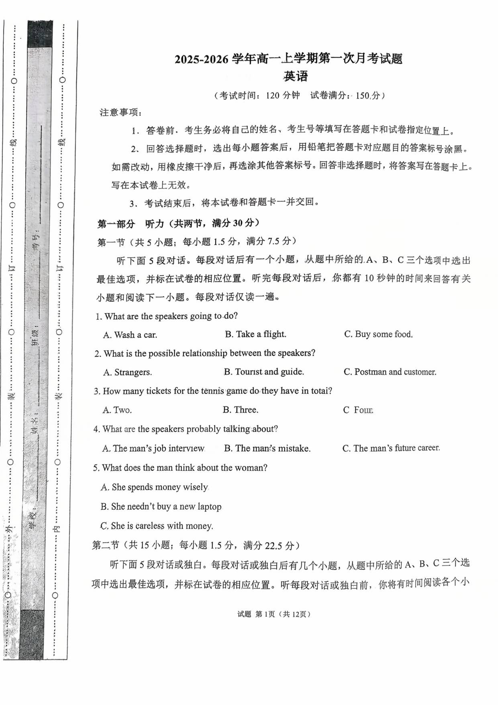 高一英语--河北省保定市部分学校2025-2026学年高一上学期9月月考