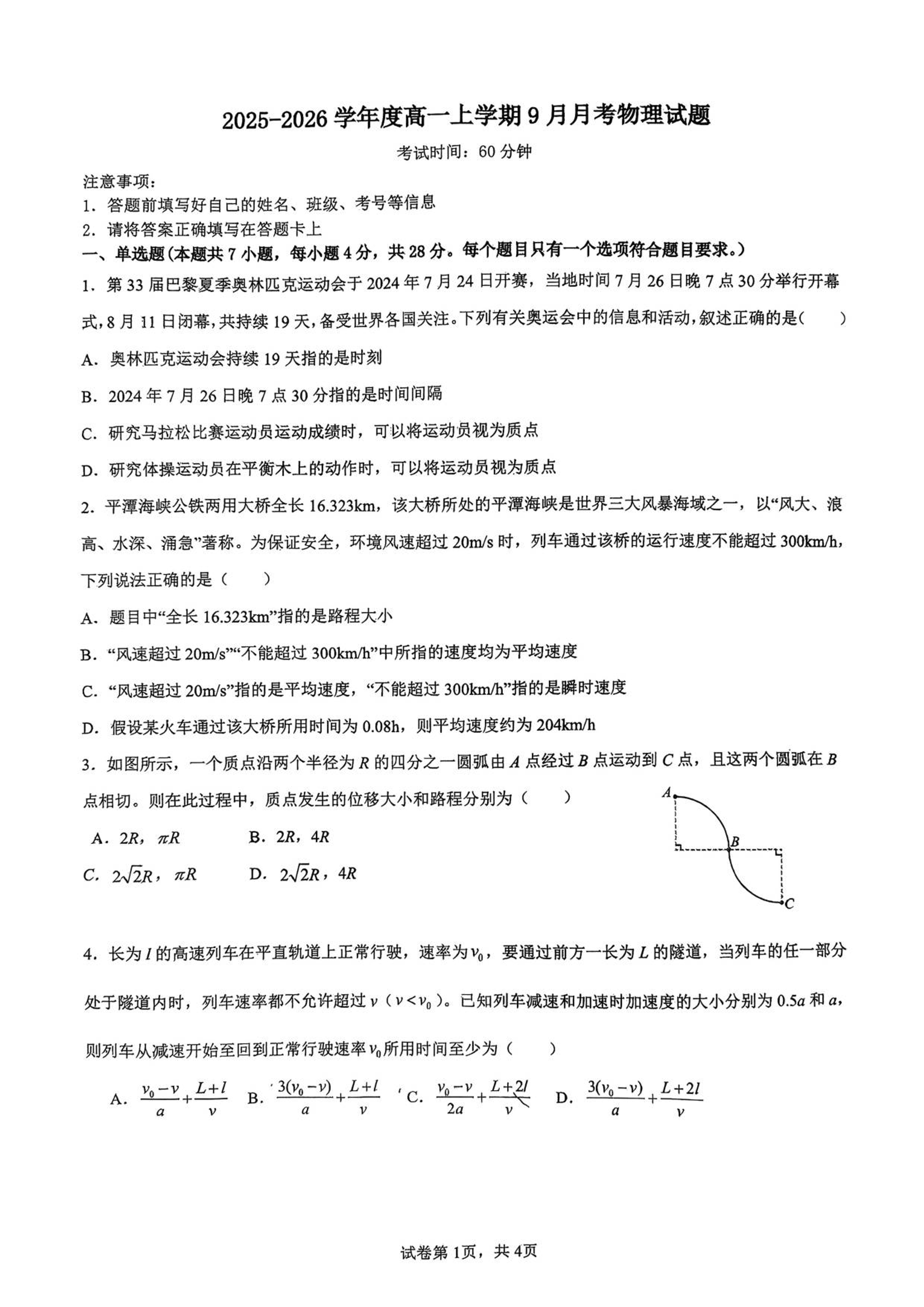 高一物理--河北省保定市部分学校2025-2026学年高一上学期9月月考