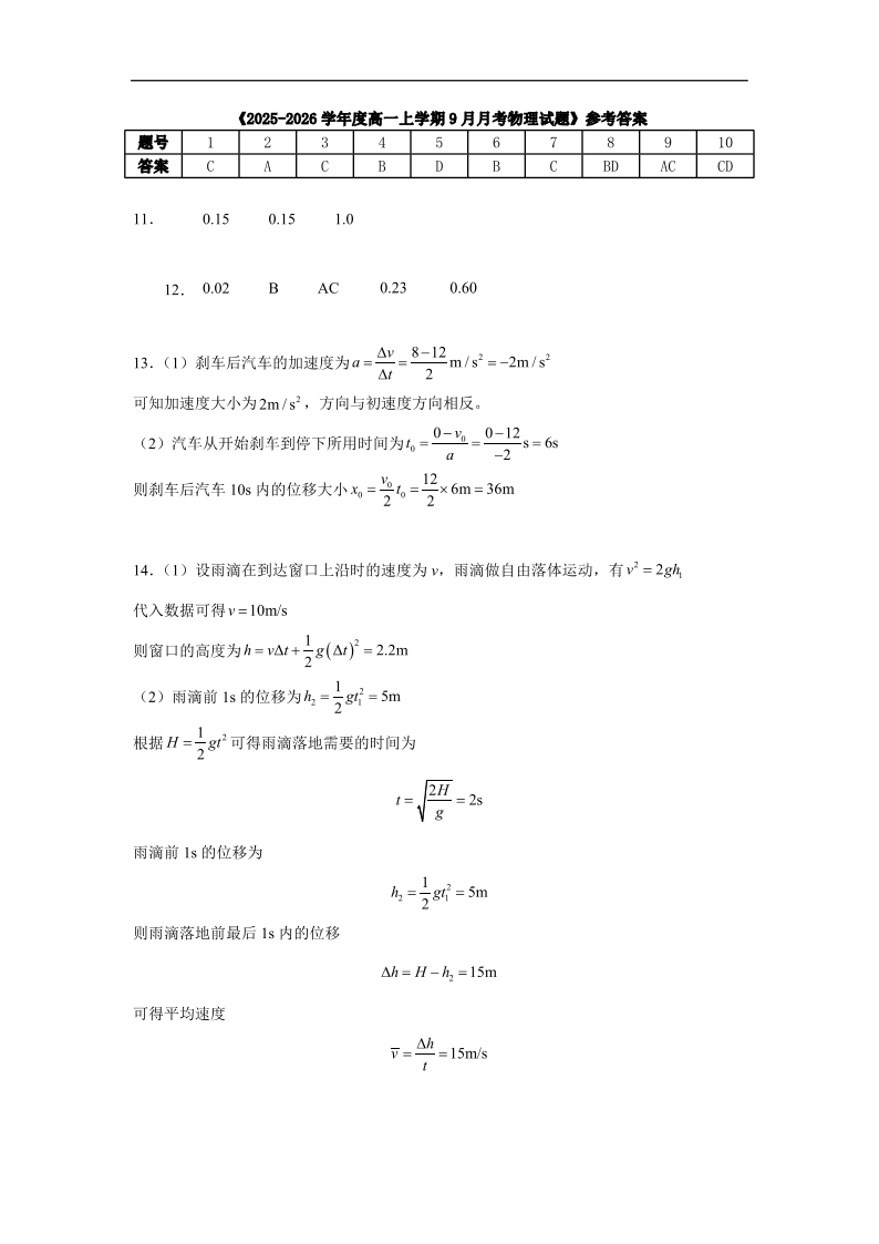 高一物理答案--河北省保定市部分学校2025-2026学年高一上学期9月月考