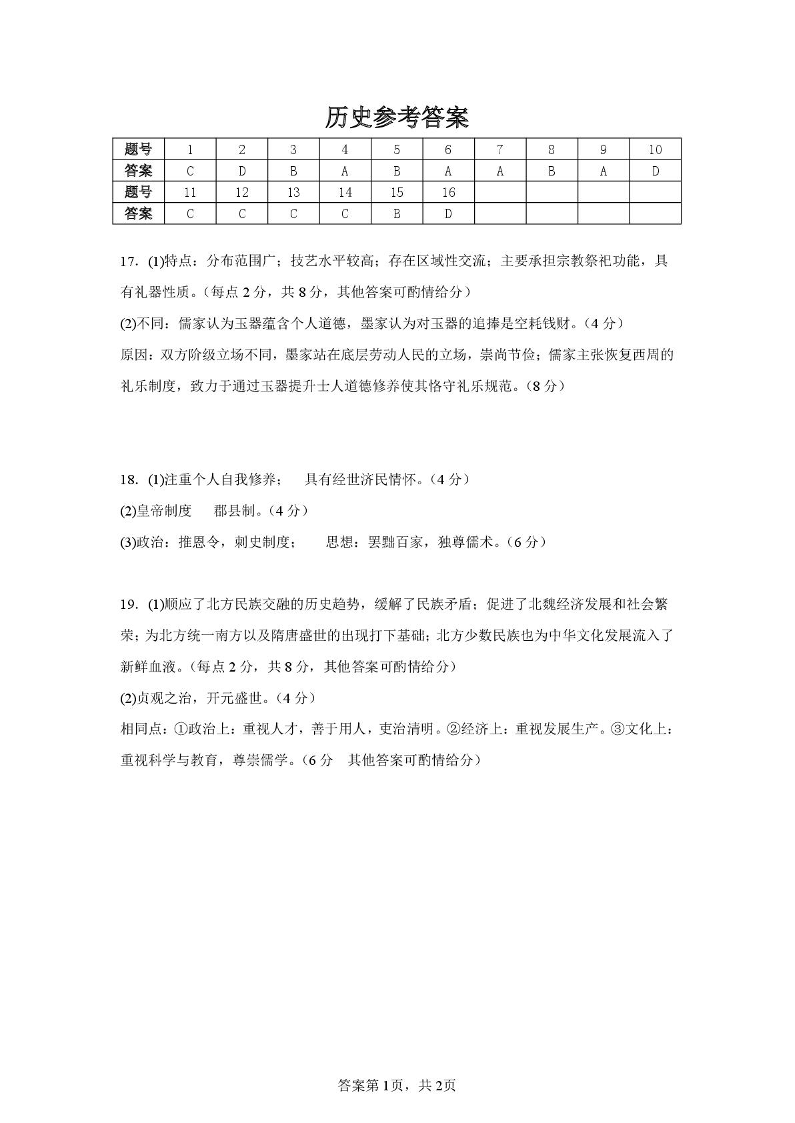 高一历史答案--河北省保定市部分学校2025-2026学年高一上学期9月月考