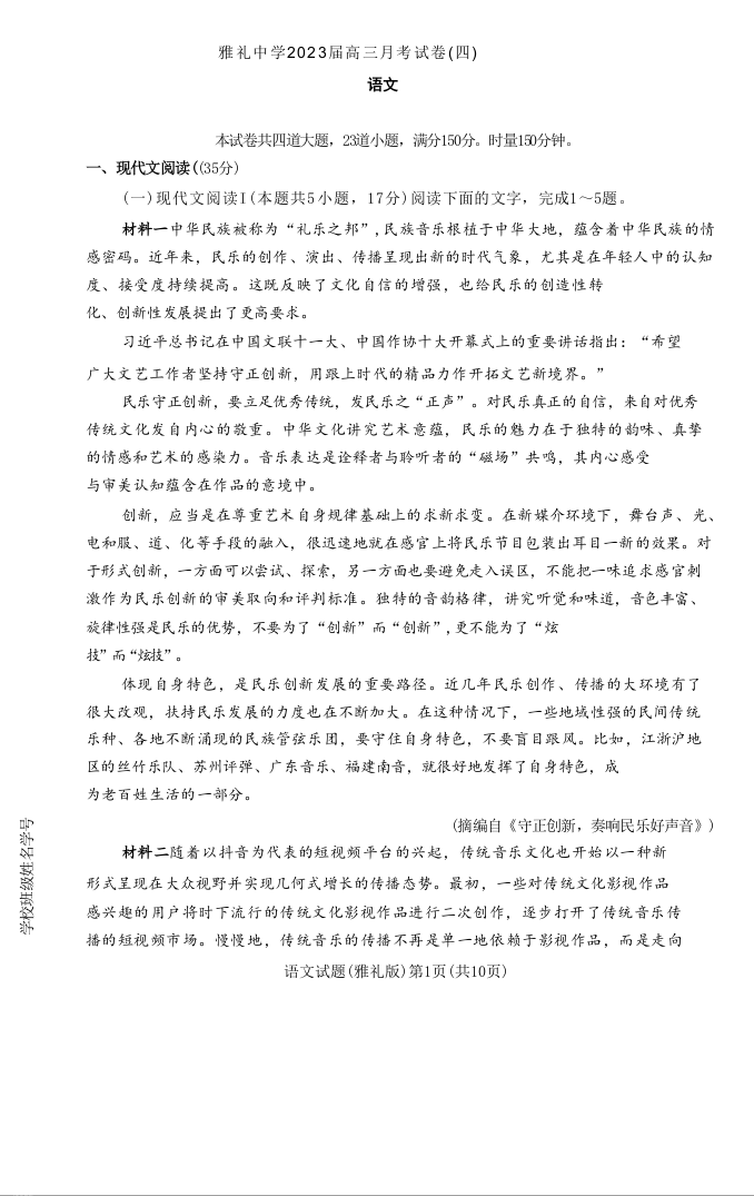 高三语文+答案-湖南省长沙市雅礼中学2022-2023学年高三上学期月考卷(四)