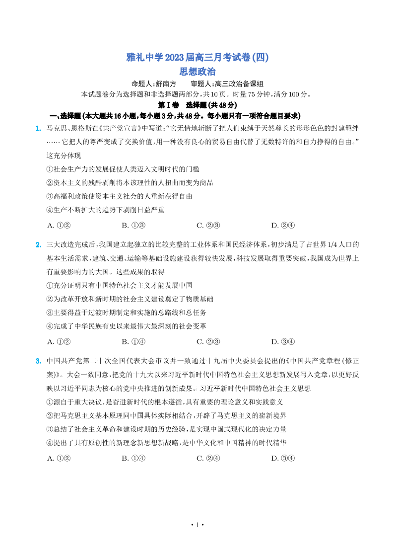 高三政治+答案-湖南省长沙市雅礼中学2022-2023学年高三上学期月考卷(四)