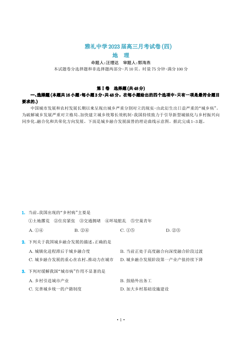 高三地理+答案-湖南省长沙市雅礼中学2022-2023学年高三上学期月考卷(四)