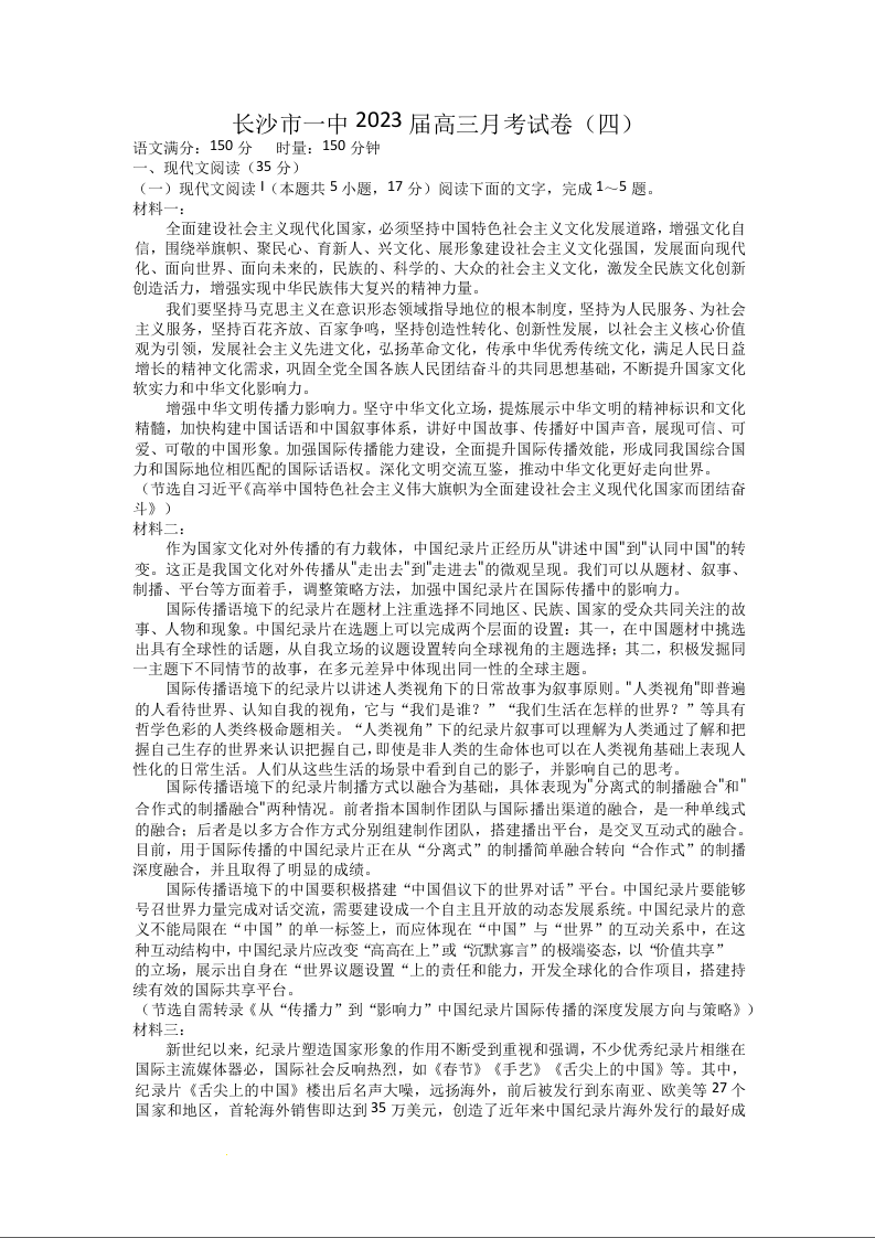 高三语文--湖南省长沙市第一中学2022-2023学年高三上学期月考(四)