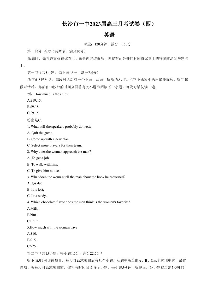 高三英语--湖南省长沙市第一中学2022-2023学年高三上学期月考(四)