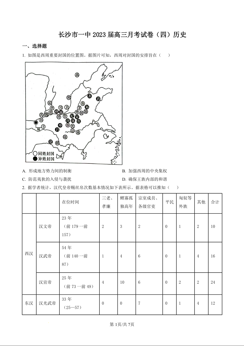 高三历史(原卷版)-湖南省长沙市第一中学2022-2023学年高三上学期月考(四)