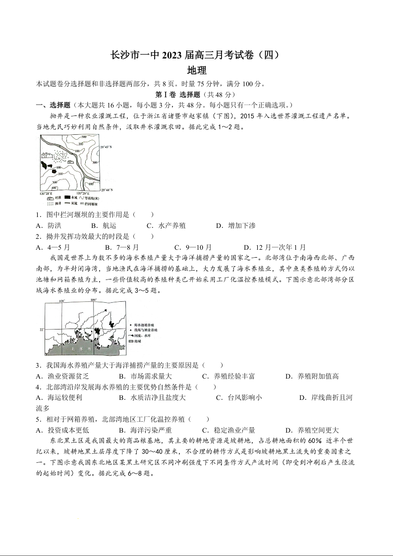 高三地理+答案-湖南省长沙市第一中学2022-2023学年高三上学期月考(四)