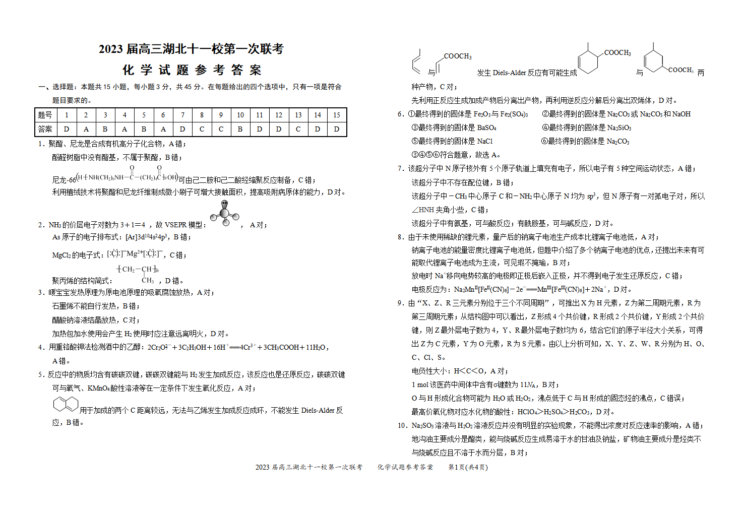高三化学答案--湖北省十一校2023届高三上学期12月第一次联考