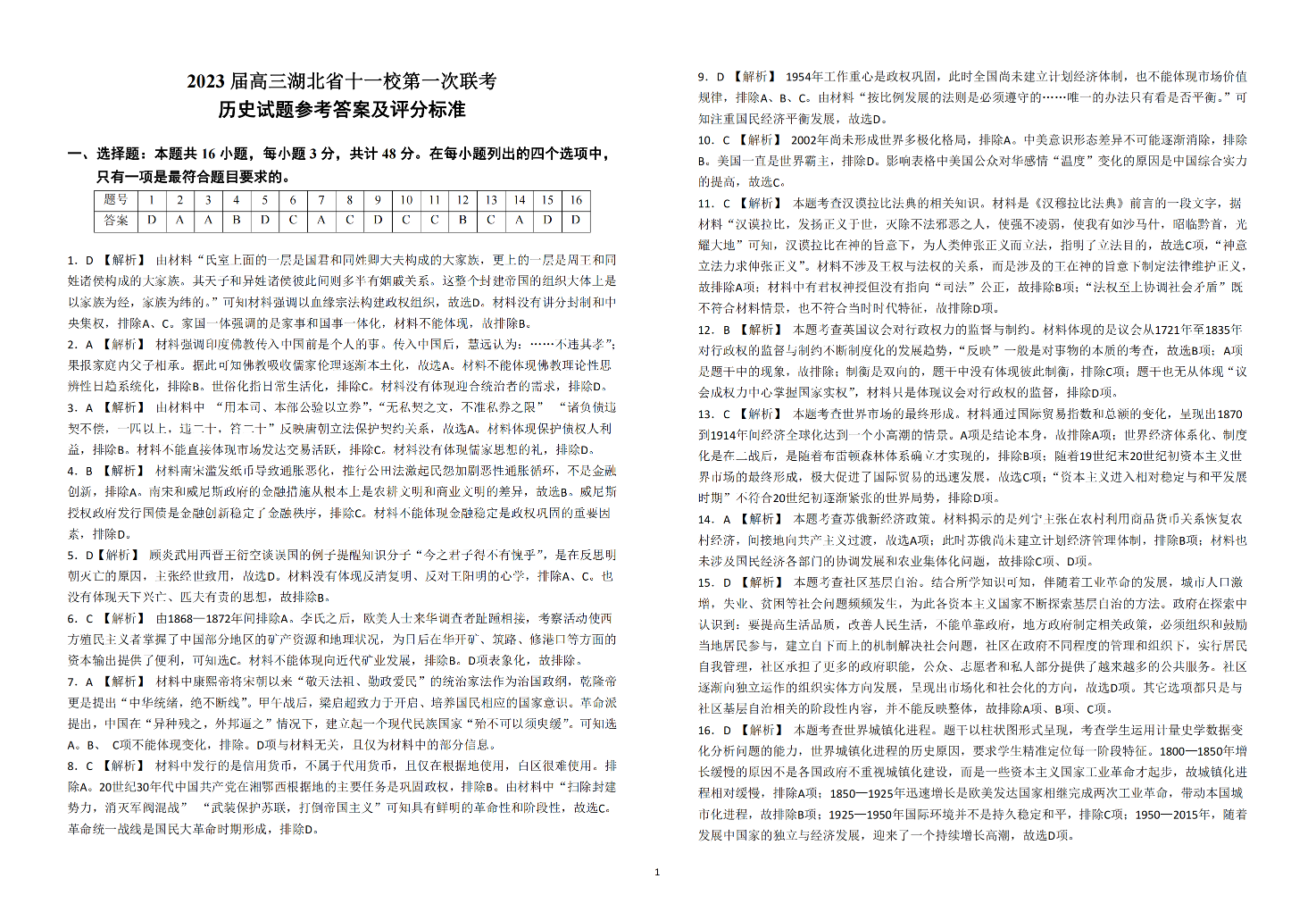 高三历史答案--湖北省十一校2023届高三上学期12月第一次联考