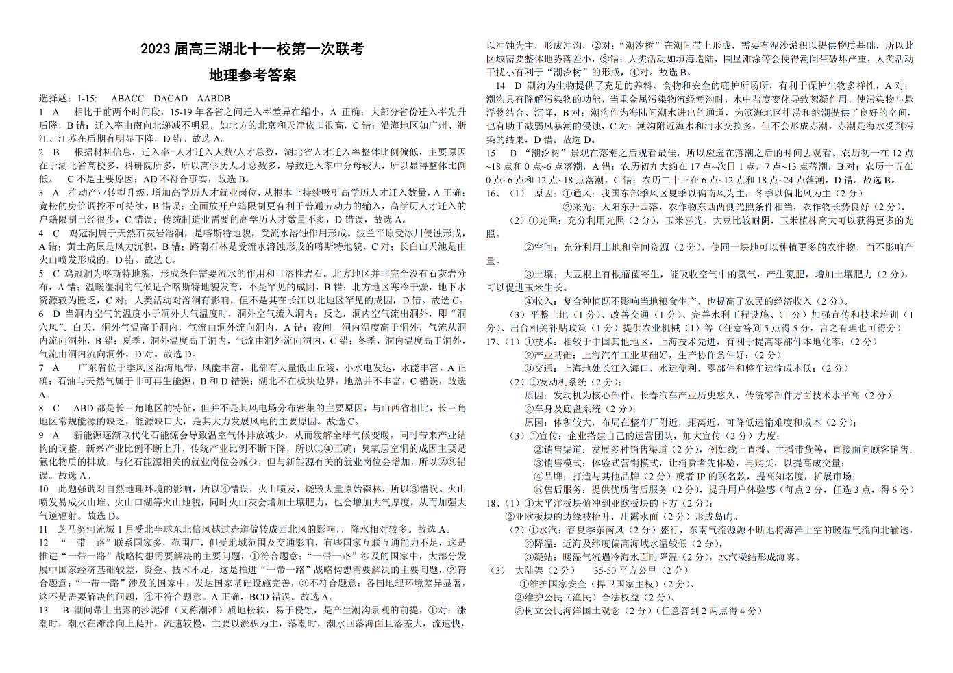 高三地理答案--湖北省十一校2023届高三上学期12月第一次联考