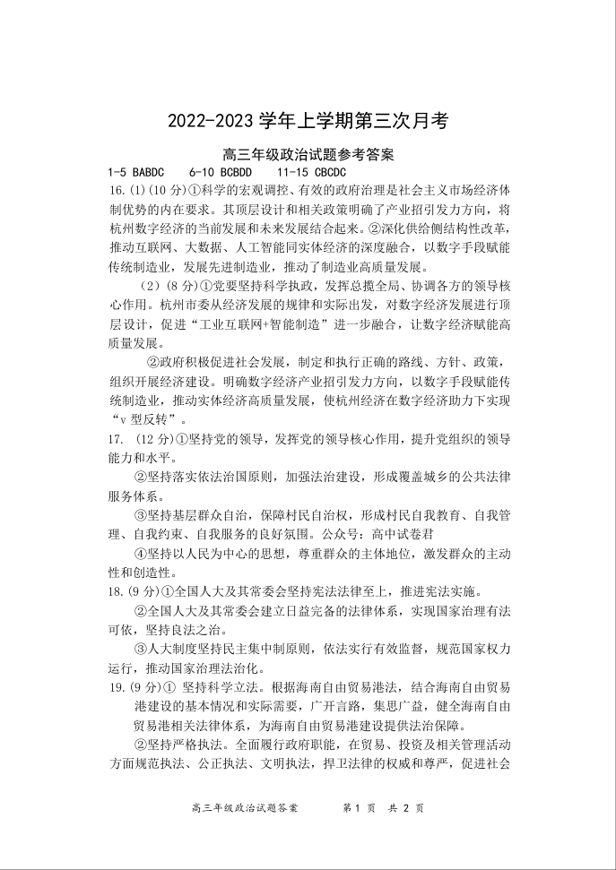 高三政治答案--河北省邢台市2022-2023学年高三上学期12月月考