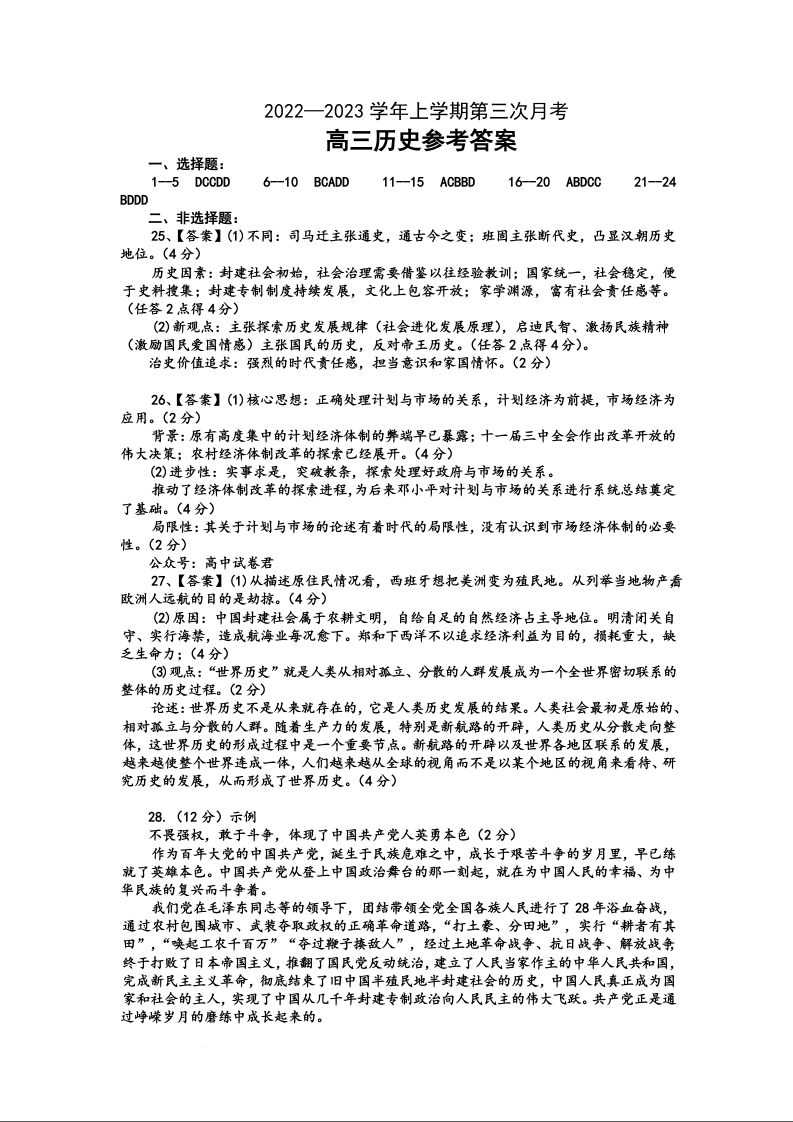高三历史答案--河北省邢台市2022-2023学年高三上学期12月月考