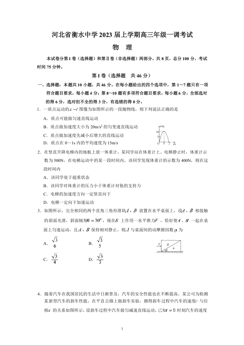 高三物理+答案--河北省衡水中学2023届高三上学期一调考试