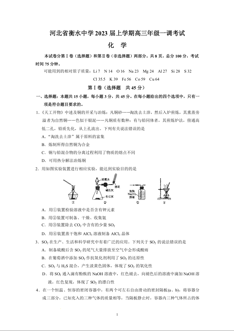 高三化学+答案--河北省衡水中学2023届高三上学期一调考试