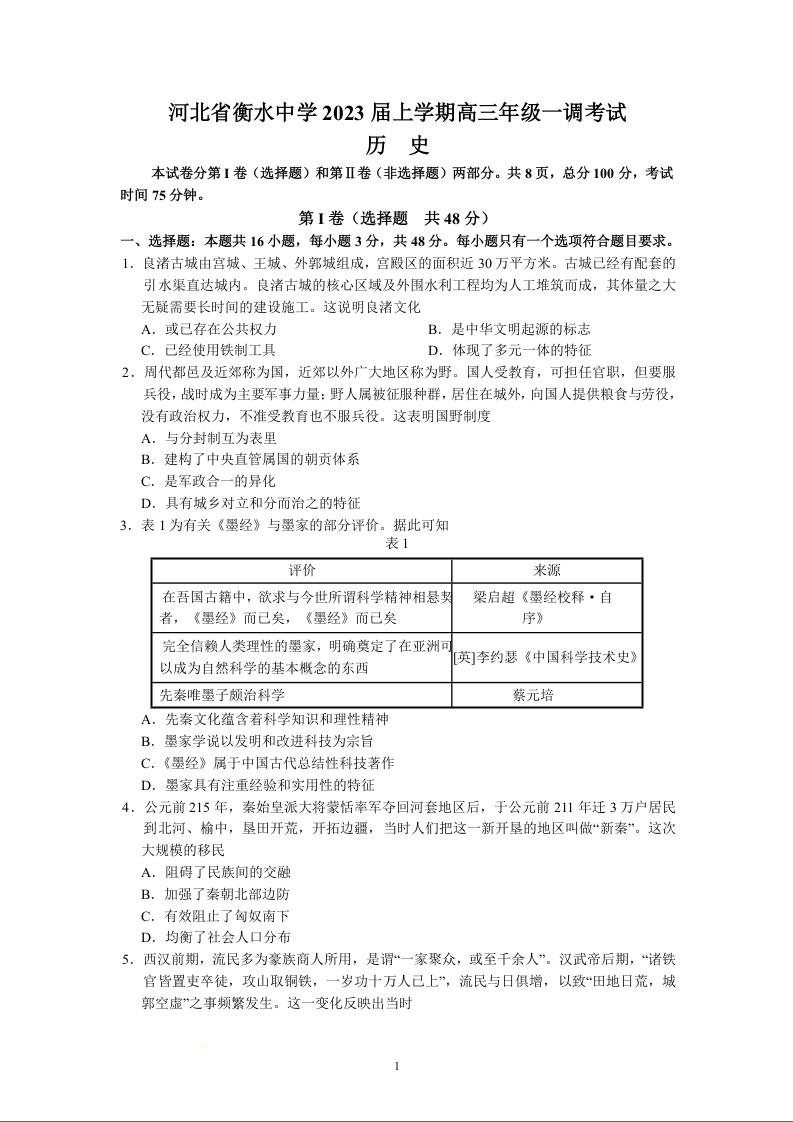 高三历史+答案--河北省衡水中学2023届高三上学期一调考试