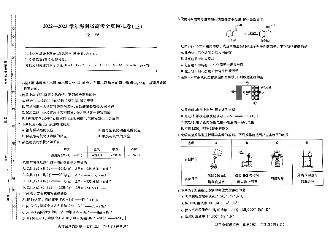 高三化学-海南省高三上2023届学期高考全真模拟(三)