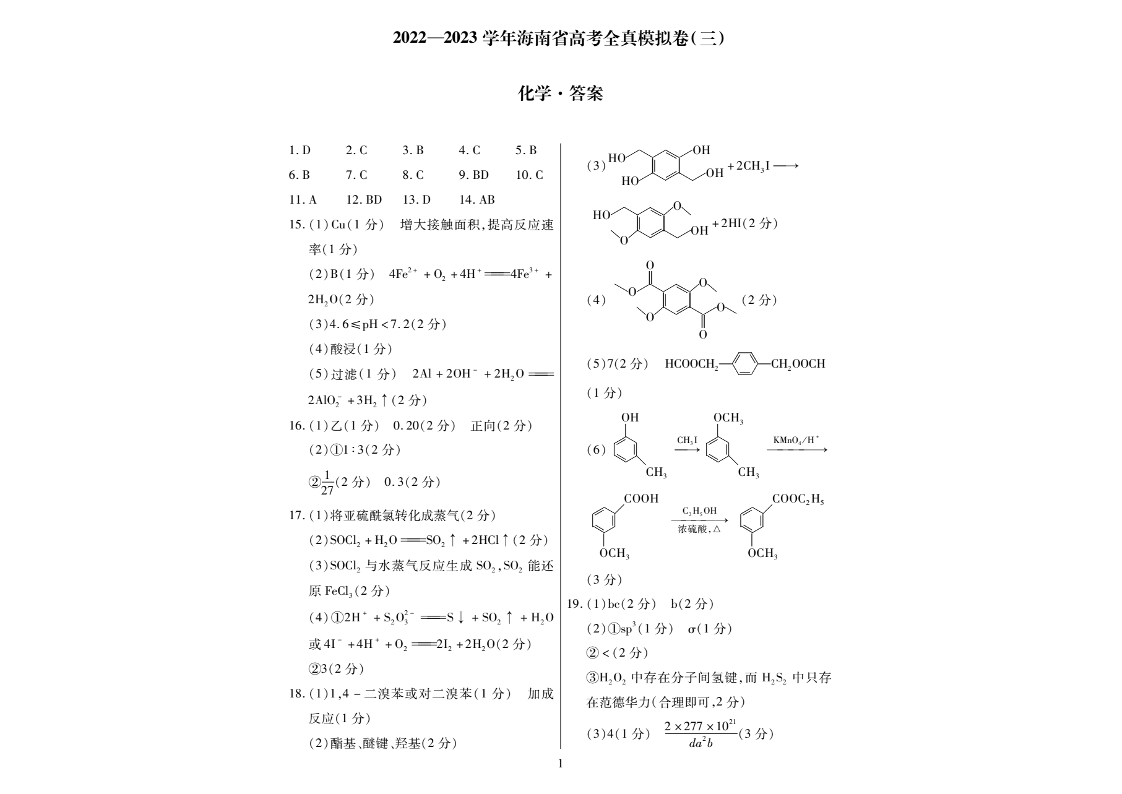 高三化学答案-海南省高三上2023届学期高考全真模拟(三)