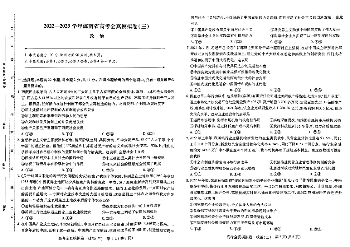 高三政治-海南省高三上2023届学期高考全真模拟(三)