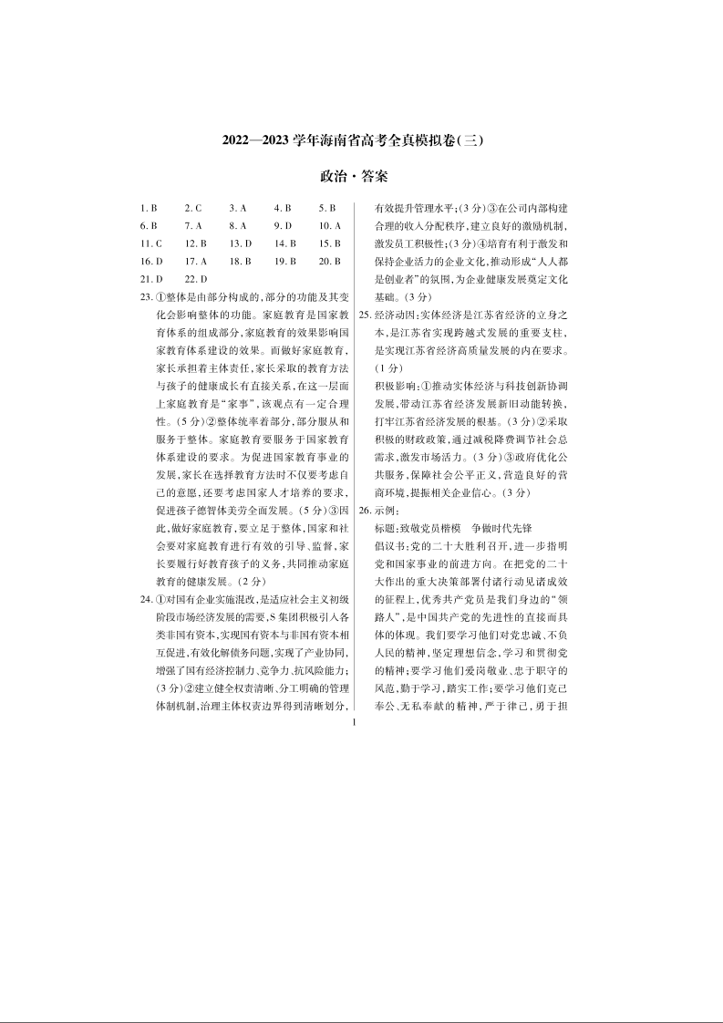 高三政治答案-海南省高三上2023届学期高考全真模拟(三)