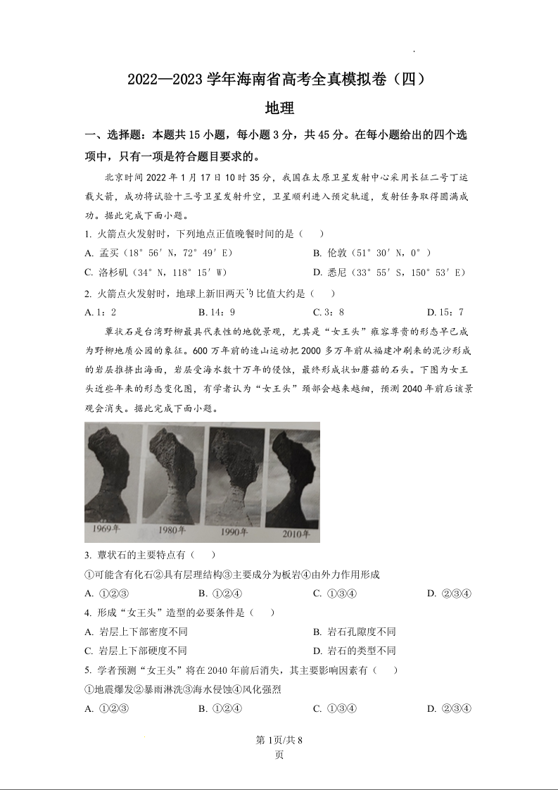 高三地理+答案-海南省2022-2023学年高考全真模拟四