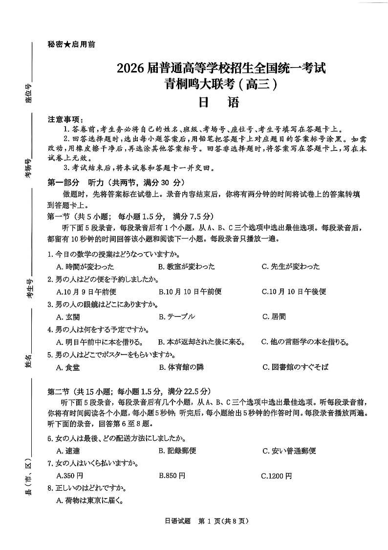 高三日语--河南省青桐鸣大联考2026届高三上学期10月联考