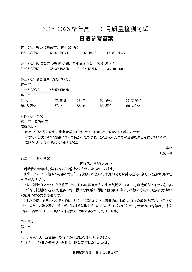 高三日语答案--河南省青桐鸣大联考2026届高三上学期10月联考