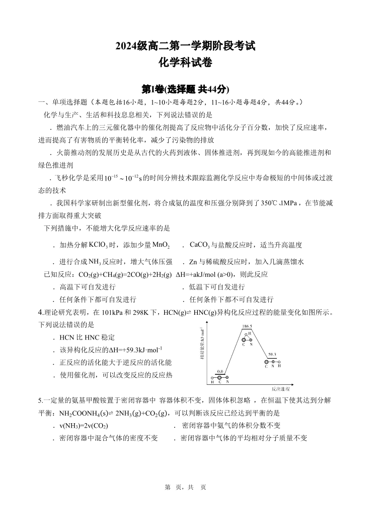 高二化学--广东省汕头市金山中学2025-2026学年高二上学期10月阶段考试