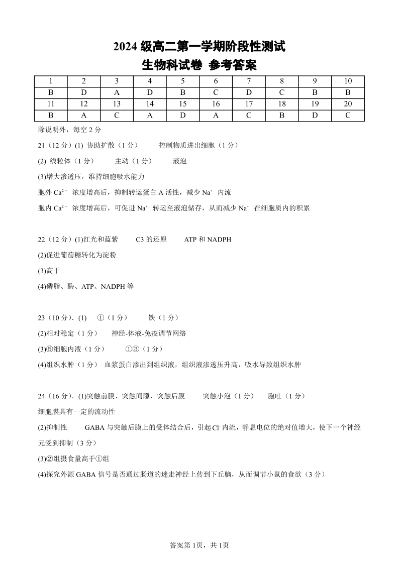高二生物答案--广东省汕头市金山中学2025-2026学年高二上学期10月阶段考试