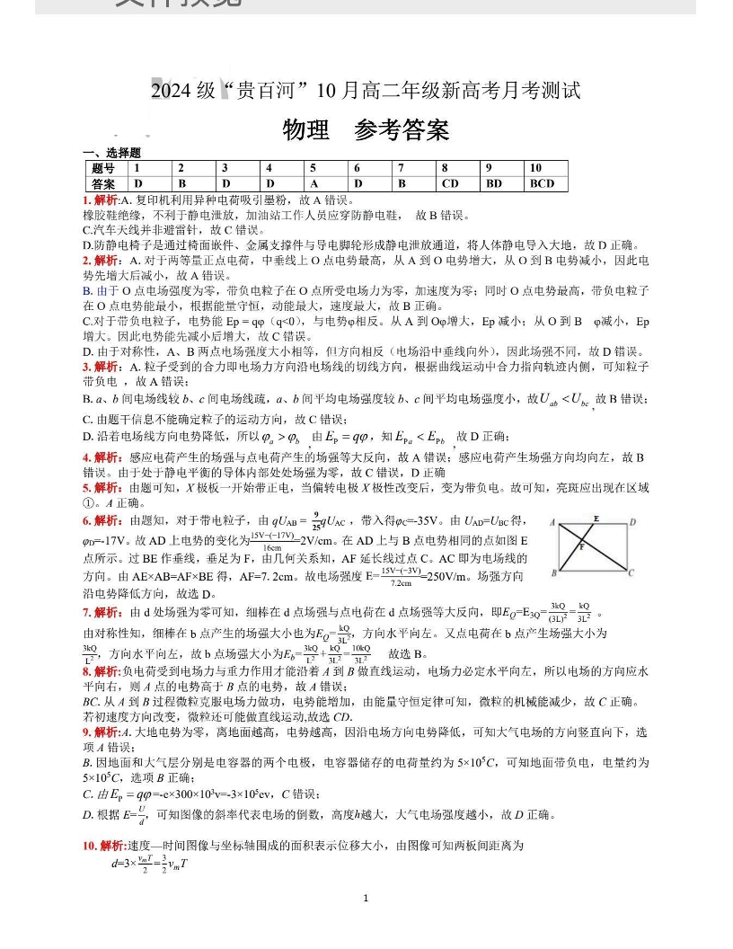 高二物理答案--广西贵百河2025-2026学年高二上学期10月考