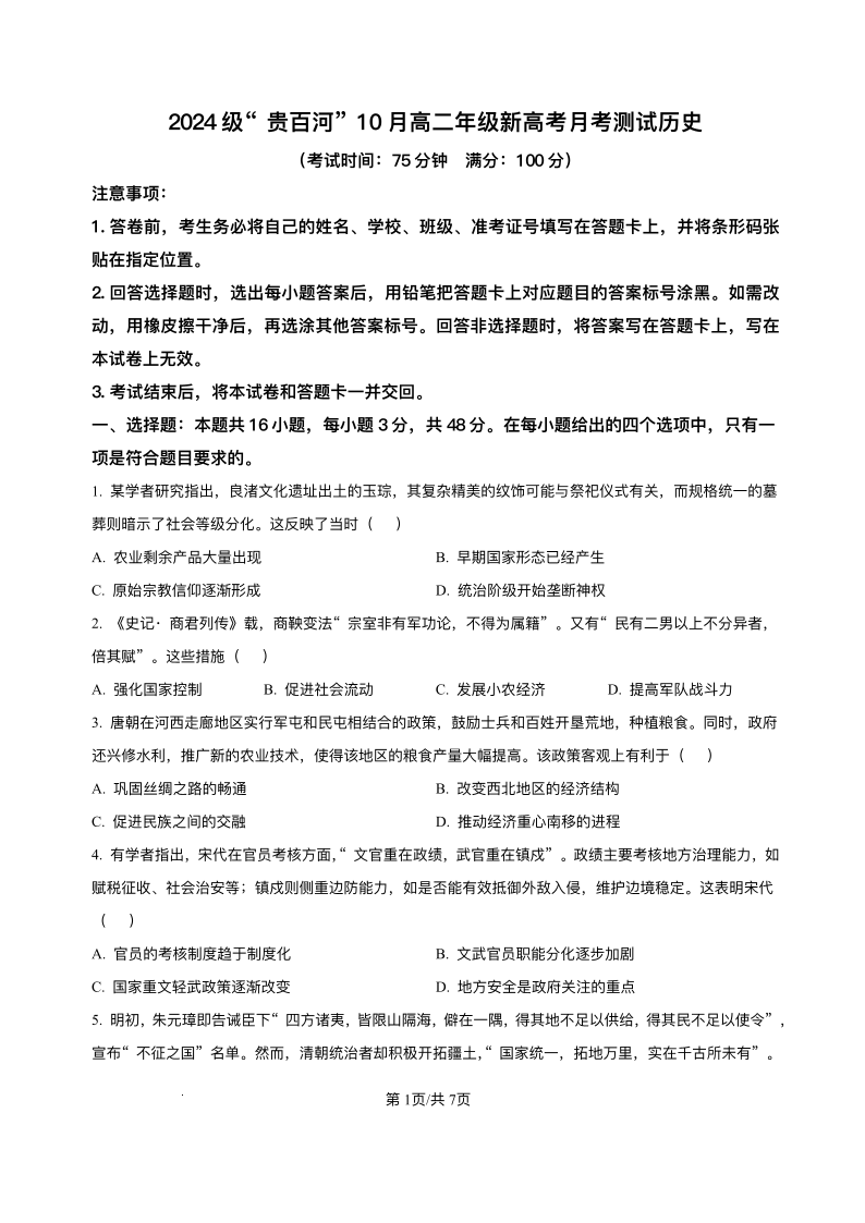 高二历史+答案--广西贵百河2025-2026学年高二上学期10月考