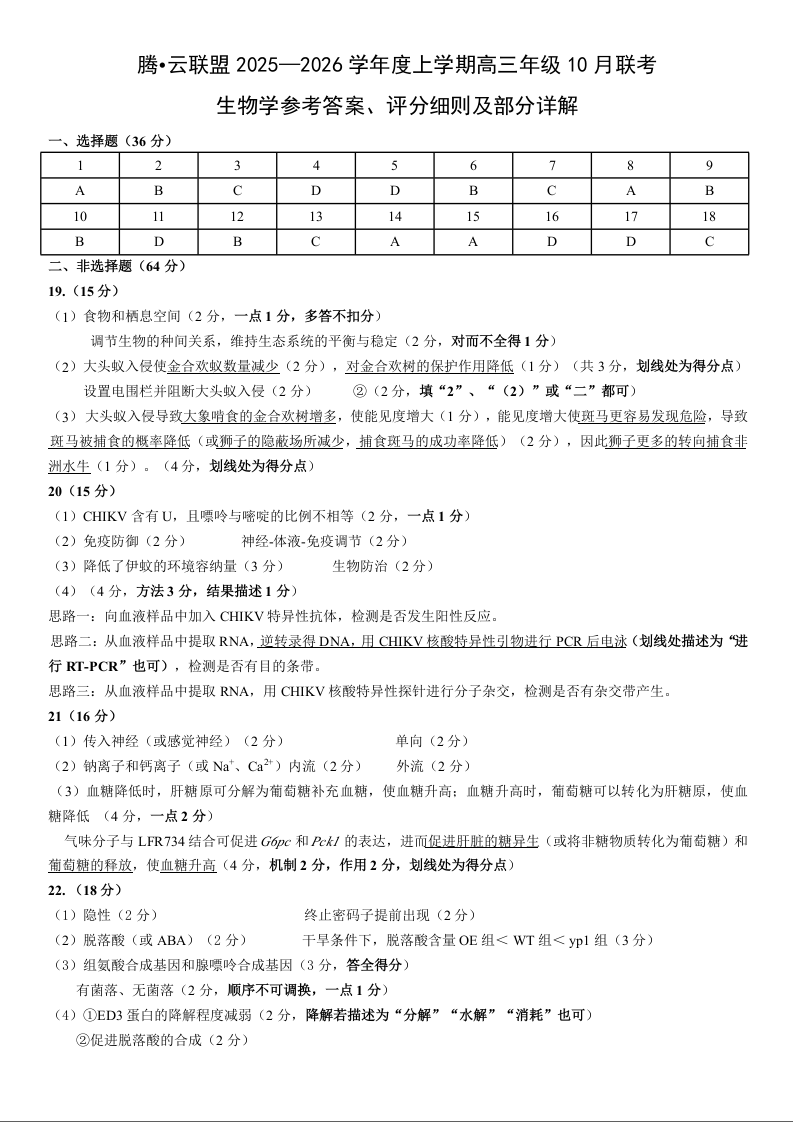 高三生物答案--湖北省腾云联盟2026届高三上学期10月联考
