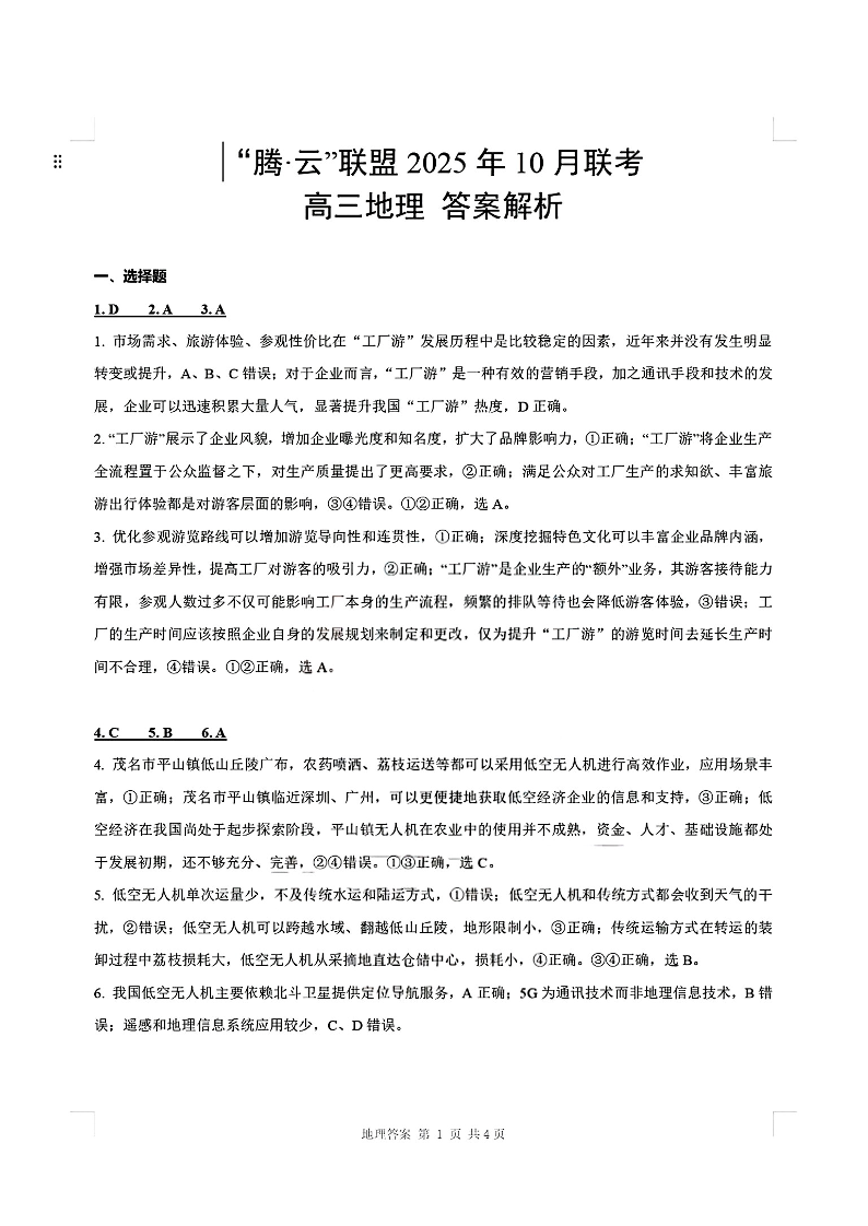 高三地理答案--湖北省腾云联盟2026届高三上学期10月联考