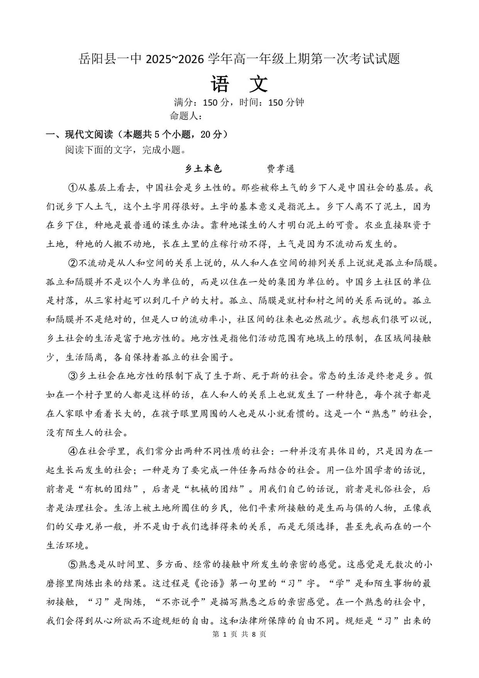 高一语文--湖南省岳阳市岳阳县第一中学2025-2026学年高一上学期第一次月考
