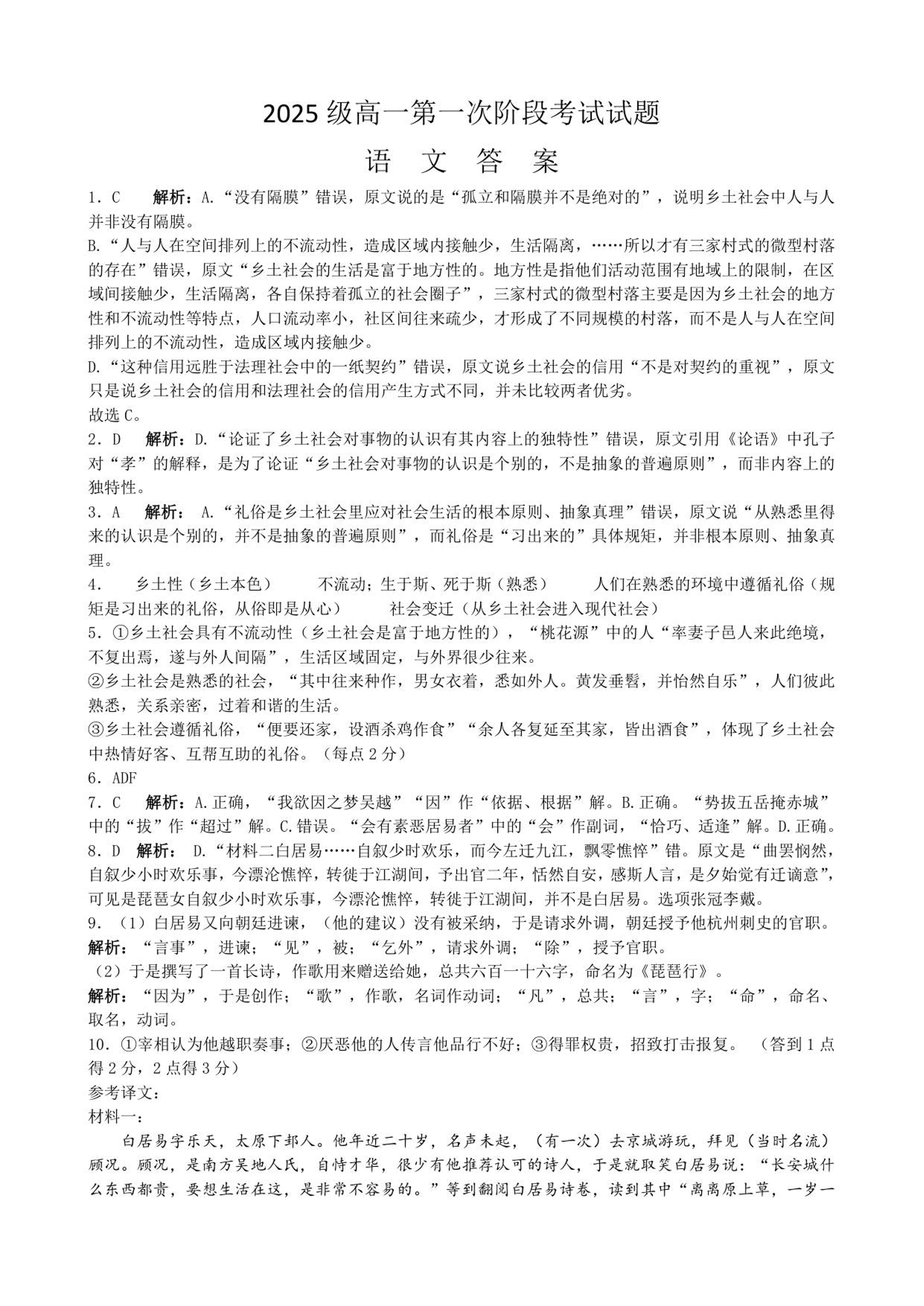 高一语文答案--湖南省岳阳市岳阳县第一中学2025-2026学年高一上学期第一次月考