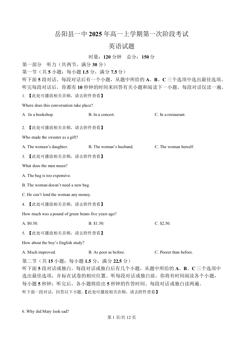 高一英语--湖南省岳阳市岳阳县第一中学2025-2026学年高一上学期第一次月考