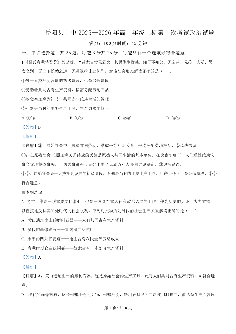 高一政治答案--湖南省岳阳市岳阳县第一中学2025-2026学年高一上学期第一次月考