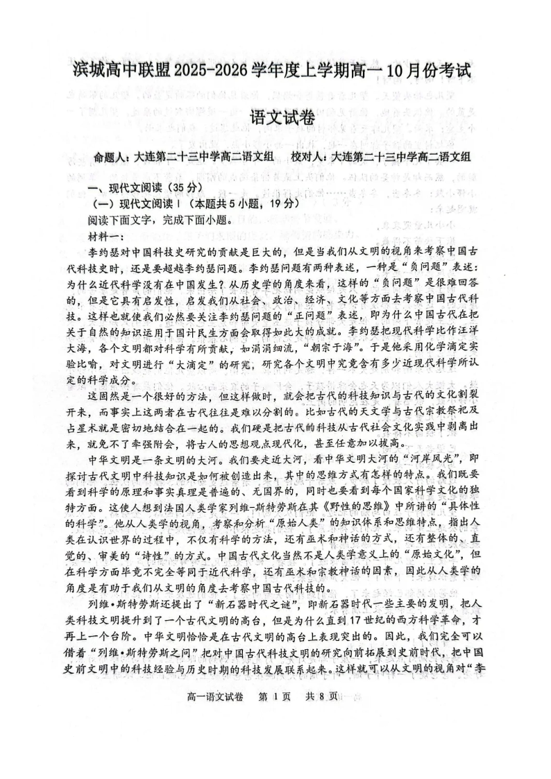 高一语文+答案--辽宁省大连市滨城高中联盟2025-2026学年度上学期高一10月份联考