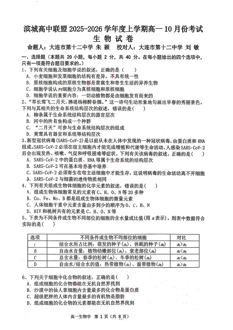 高一生物+答案--辽宁省大连市滨城高中联盟2025-2026学年度上学期高一10月份联考